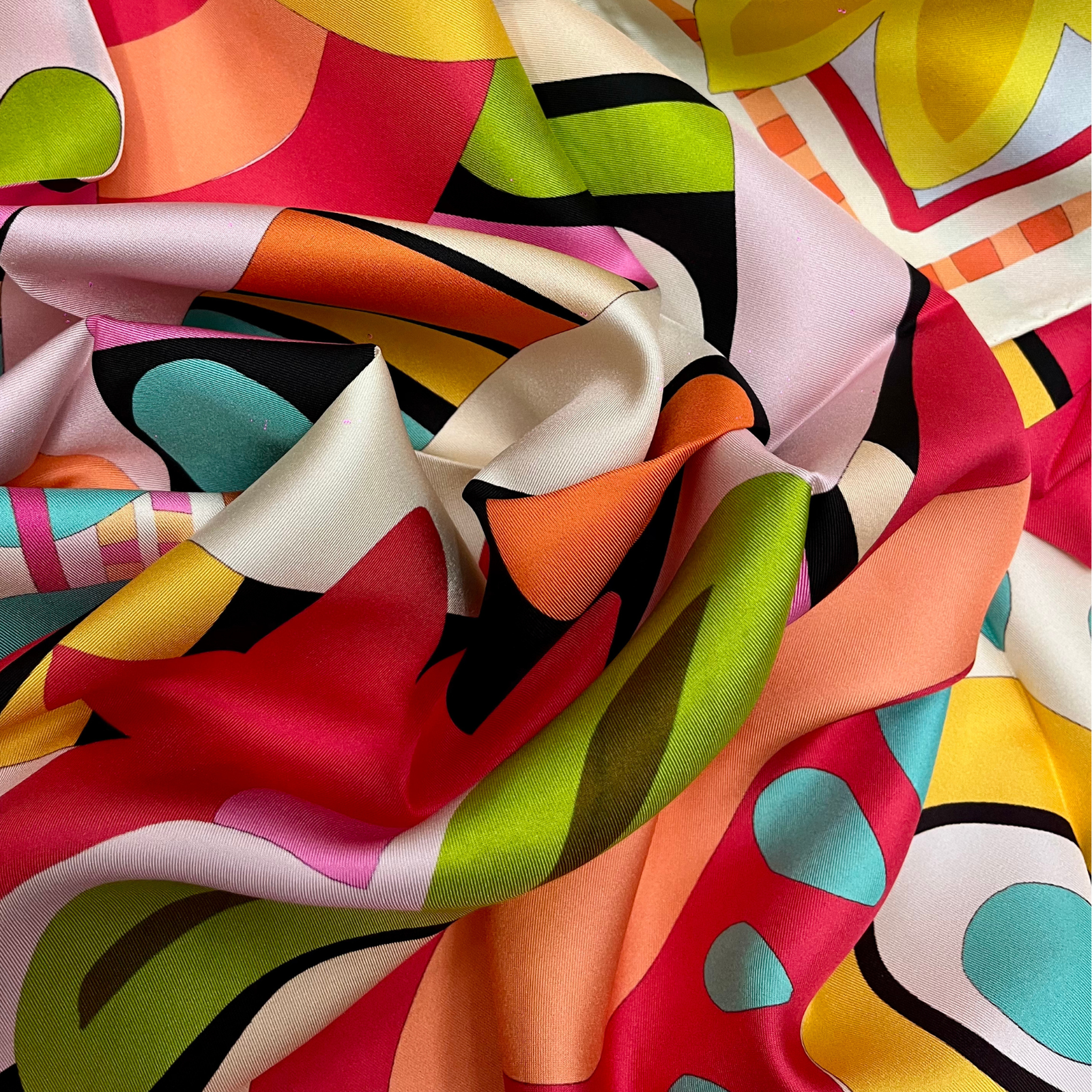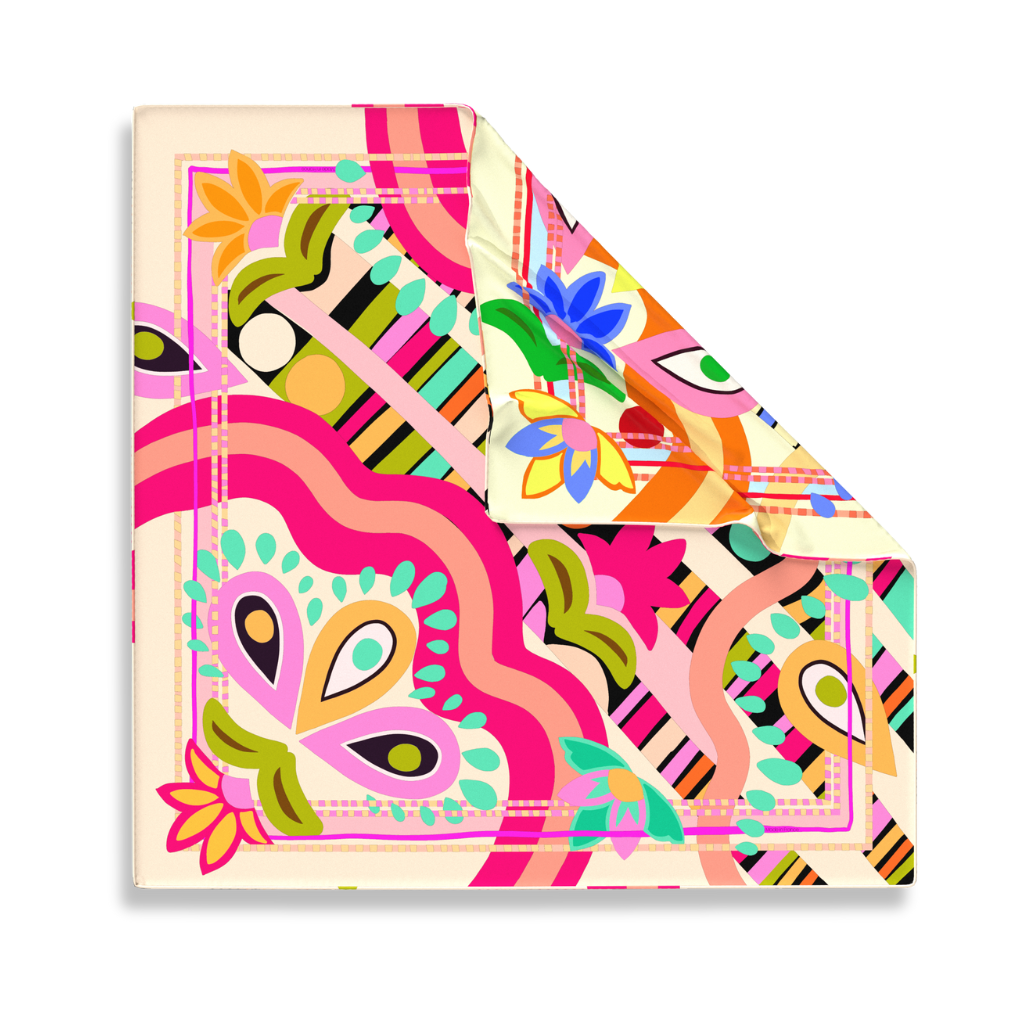 Bold, abstract, and unapologetically funky: this double-sided silk scarf is made to stand out. Bursting with energy and unexpected shapes, the design brings a playful edge to the elegance of silk.
